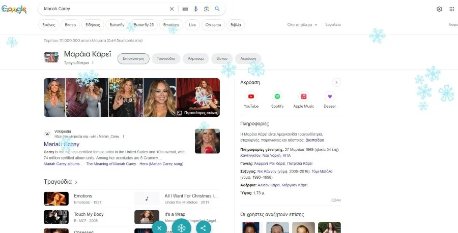 Συγκεκριμένα, αν κάνετε αναζήτηση για τη δημοφιλή σταρ είστε στα ελληνικά, είτε στα αγγλικά, δηλαδή Mariah Carey ή Μαράια Κάρεϊ, τότε θα δείτε την οθόνη του υπολογιστή σας να γεμίζει… χιονονιφάδες.